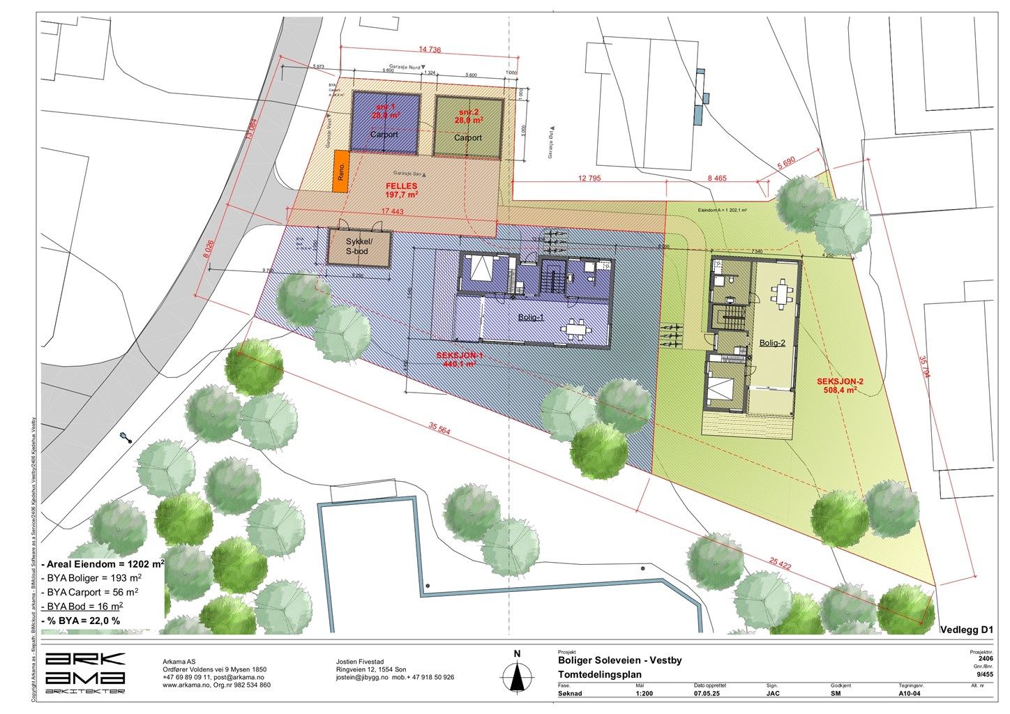 Eiertomt på ca. 462 kvm. Eiendommen er under seksjonering og hvor seksjon 1 har et beregnet areal på ca. 462 kvm. I tillegg til tomtearealet for seksjon 1 tilkommer det et fellesareal med seksjon 2 på ca. 232 kvm. Fellesarealet er tiltenkt område for felles adkomst, carport, sykkelbod og renovasjon. Grunnkart viser at tomtegrensen mot nord er nøyaktig (<=10 cm) og øvrige tomtegrenser er middels nøyaktige (>10 cm <= 30 cm). Eiendomsrapport datert 09.04.2025 oppgir et beregnet areal på 1.202,2 kvm før seksjonering.