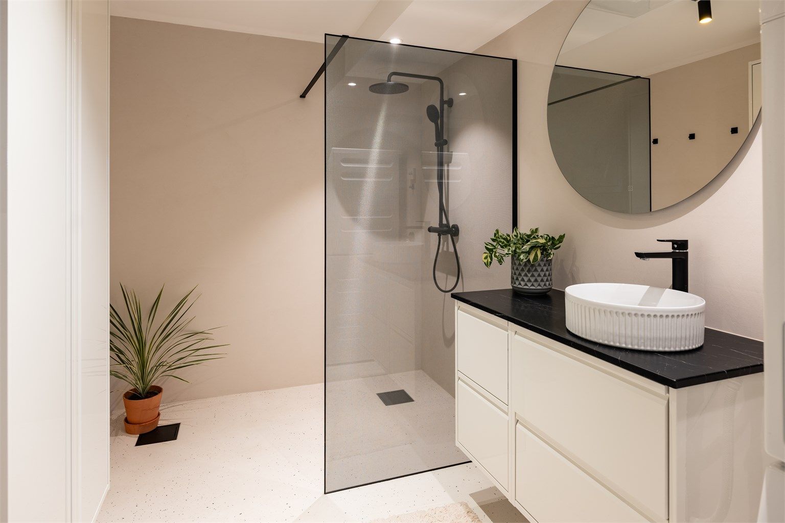 - Nydelig bad fra 2025 med mikrosement, opplegg for vaskemaskin og downlights.