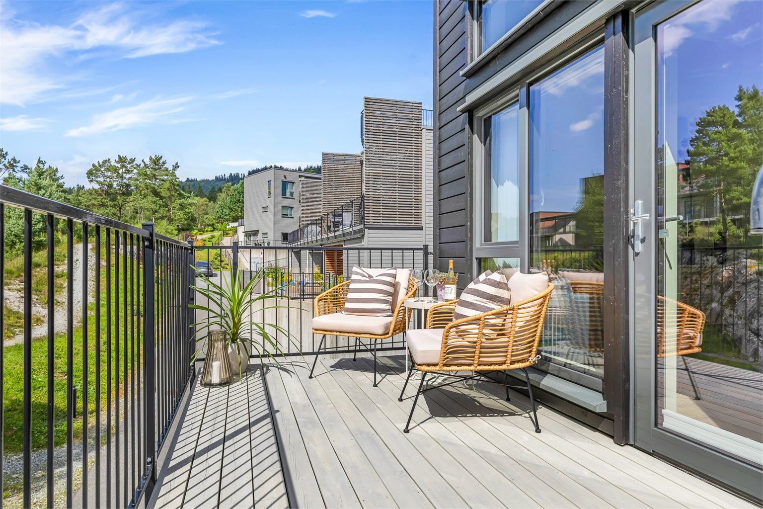 Lekkert og nyere funkisinspirert enderekkehus sentralt på Knarvik. Fra boligen er det kort gangavstand til alt Knarvik har å by på av butikker, barnehager, skoler i alle alderstrinn, turløyper, fritidstilbud med mer. Meget gode solforhold på boligens 3 altaner og i tillegg stor takterrasse med flott utsikt. Boligen ble oppgradert med nytt stilrent kjøkken og nye garderober i 2023. Da ble det også langt nye gulv, malt tak og vegger mm.