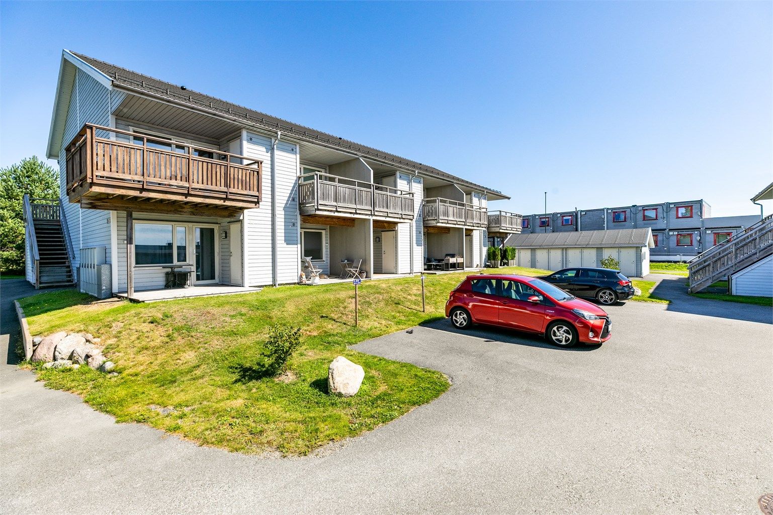 Utvendig bod på terrassen og på bakkeplan i felles bodrekke