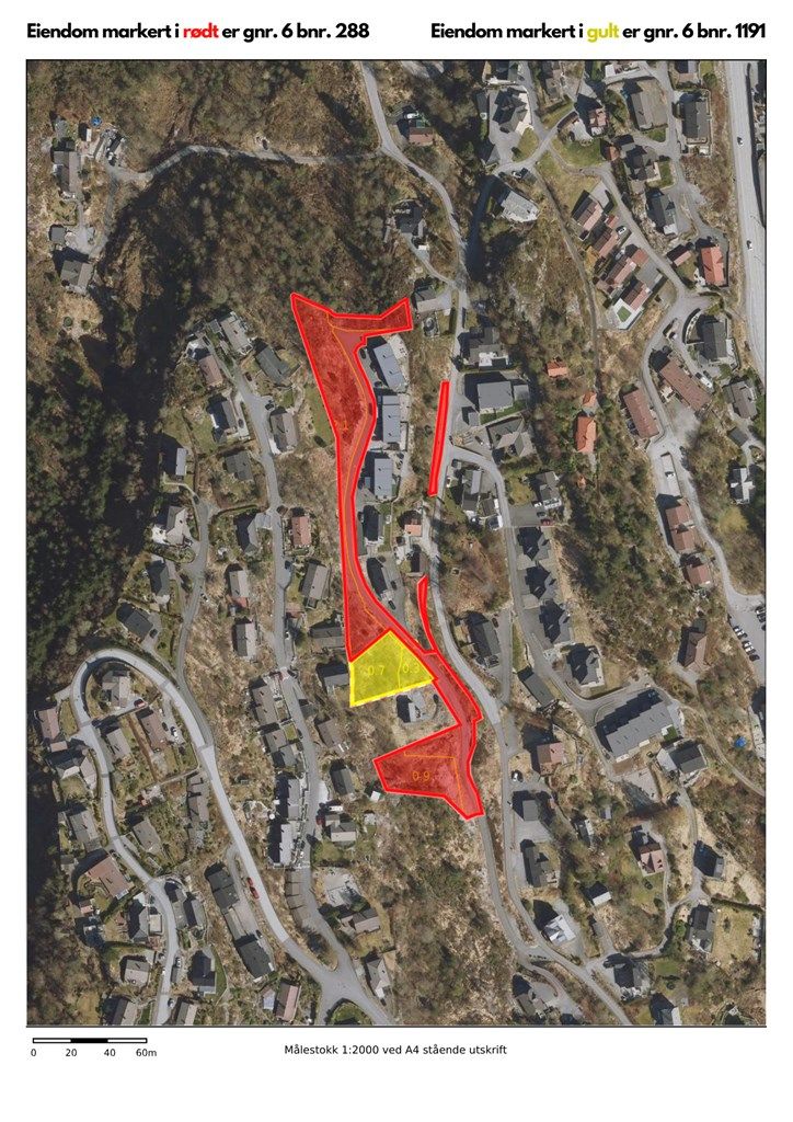 Bnr. 288 er oppmålt til 5 739 kvm. og består av boligtomt, intern vei, skråninger og snuplass. Boligtomten ligger i skrått terreng.