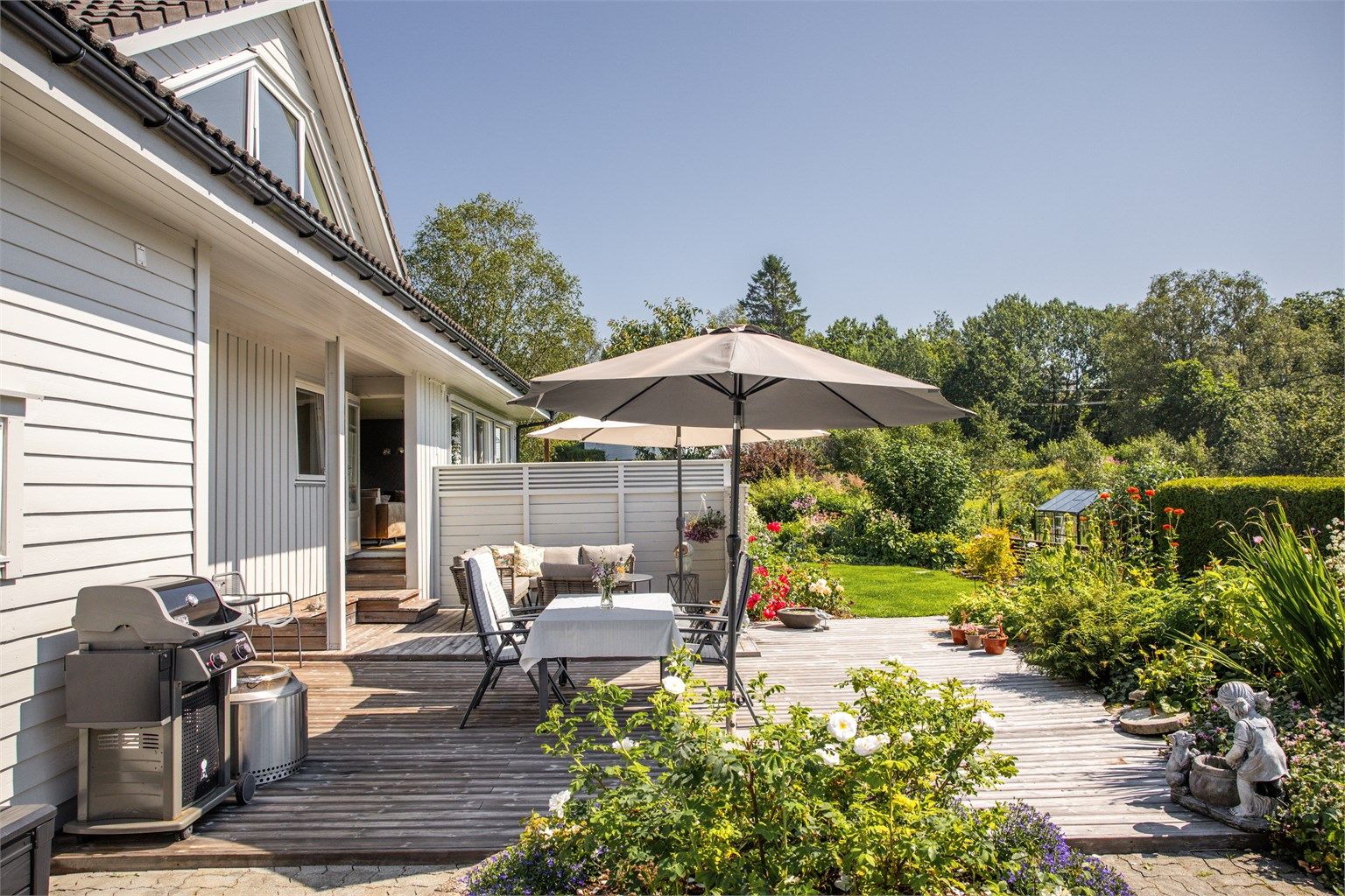 Nydelig opparbeidet hageanlegg med fine og solrike uteplasser