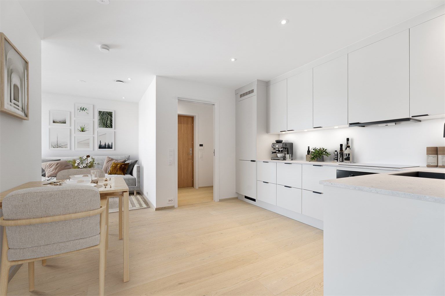 Leiligheten har arealeffektiv og åpen planløsning, lekkert kjøkken fra Strai, stue med utgang til balkong, to lyse soverom, bad og entre. Bod i kjeller.