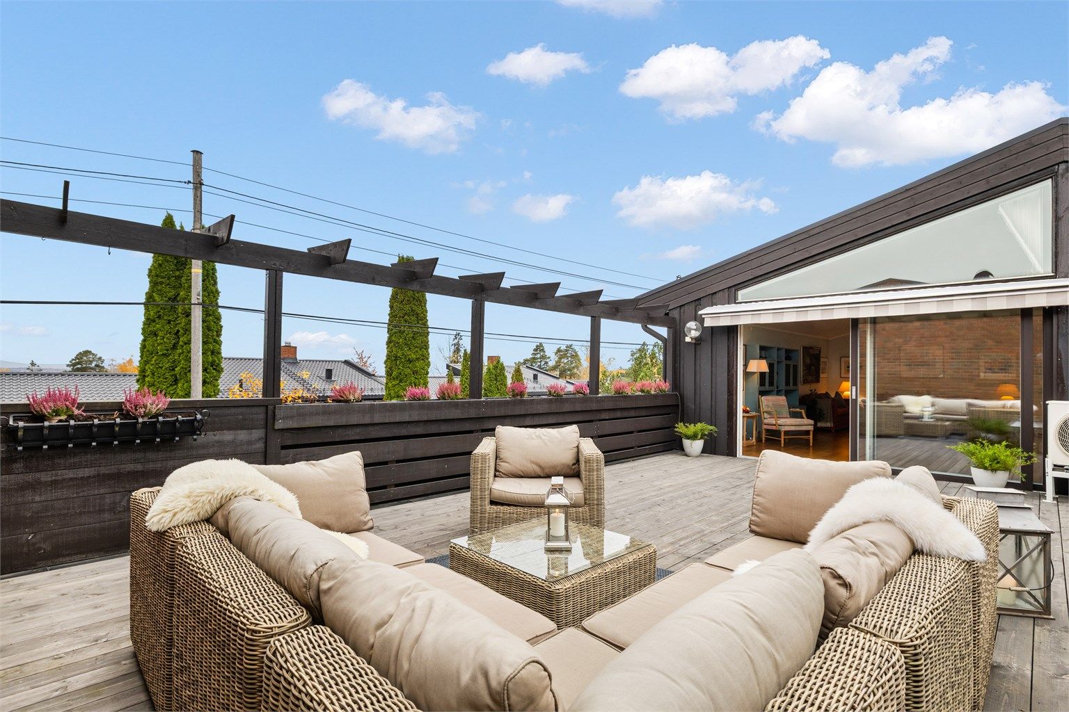 Boligen har en spennende planløsning med en romslig stue på eget halvplan, komplett med peis og en nyere varmepumpe. Meget god takhøyde gir en god romfølelse. Fra stuen er det utgang til en luftig, solrik, vestvendt terrasse med sjøglimt. Videre inneholder boligen en hyggelig spisestue, to soverom, en romslig TV-stue, et moderne bad fra 2010, separat vaskerom og WC-rom. Det er også rikelig med lagringsplass i bod, kjølerom og en garasjeplass i felles anlegg. Hagedelen ble i sommer oppgradert.