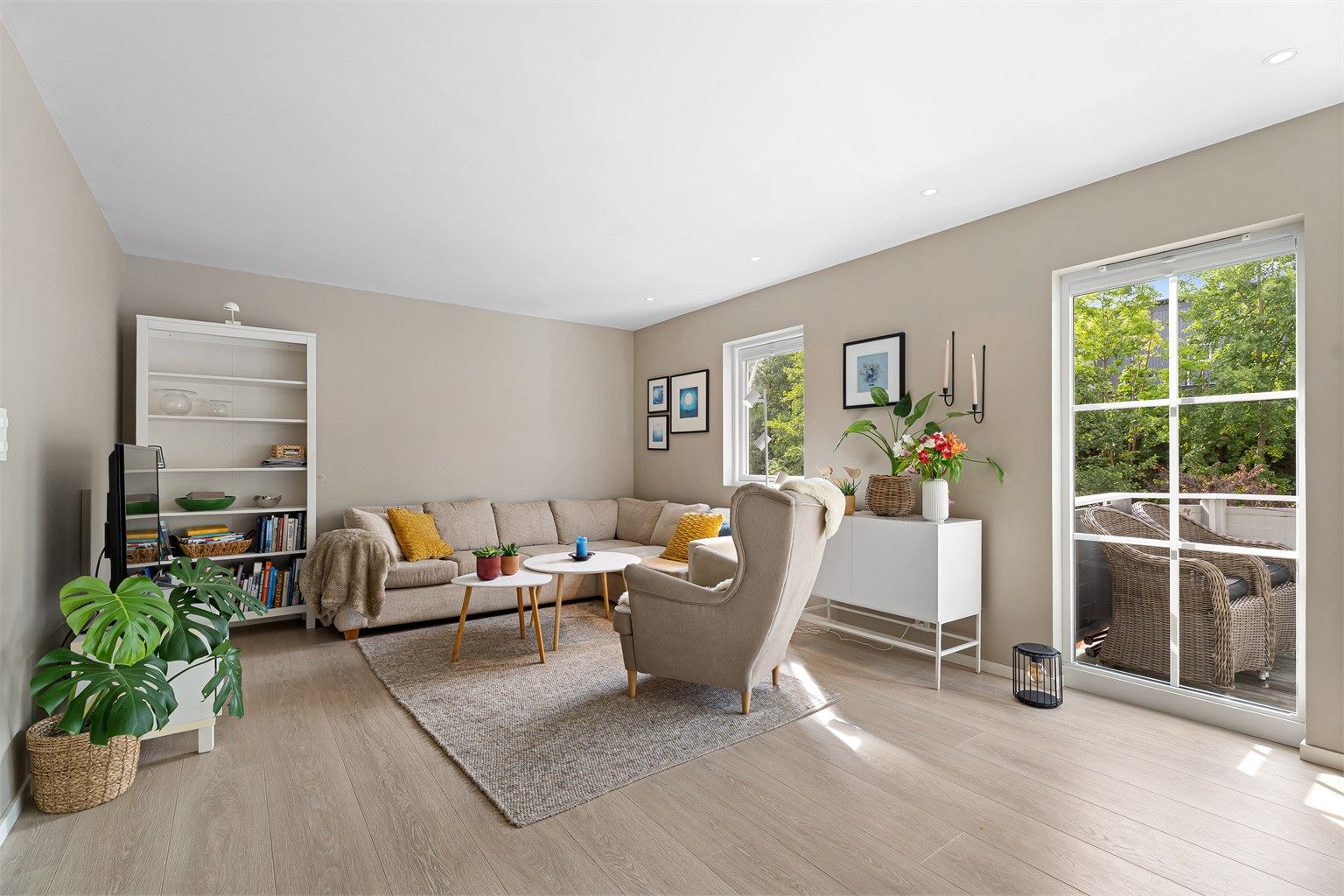 Inneholder bla. romslig stue og Strai kjøkken, 2 soverom, 2 romslige bad. Solrike uteplasser på hver side av boligen. Utvendig bod.