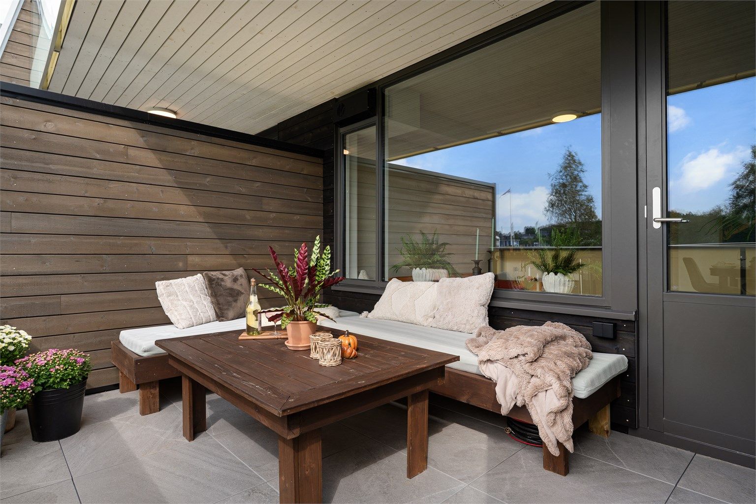 Sørvestvendt balkong på ca 11 kvm med fin utsikt mot et grønt og fint fellesareal, og her er meget gode solforhold fra tidlig formiddag til sent på kveld sommerstid.