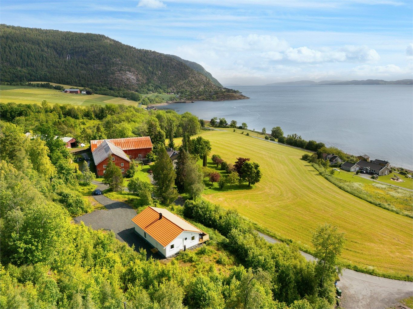 Boligen har flott beliggenhet i terrenget med storslagen utsikt over fjorden. Eiendommen er omgitt av åker og skog, og den vakre, landlige beliggenheten sørger for frodige boligomgivelser. Det er 300 meter ned til fjorden og stranda, og samtidig umiddelbar tilgang til skogsstier, fine landeveier og turløyper.
