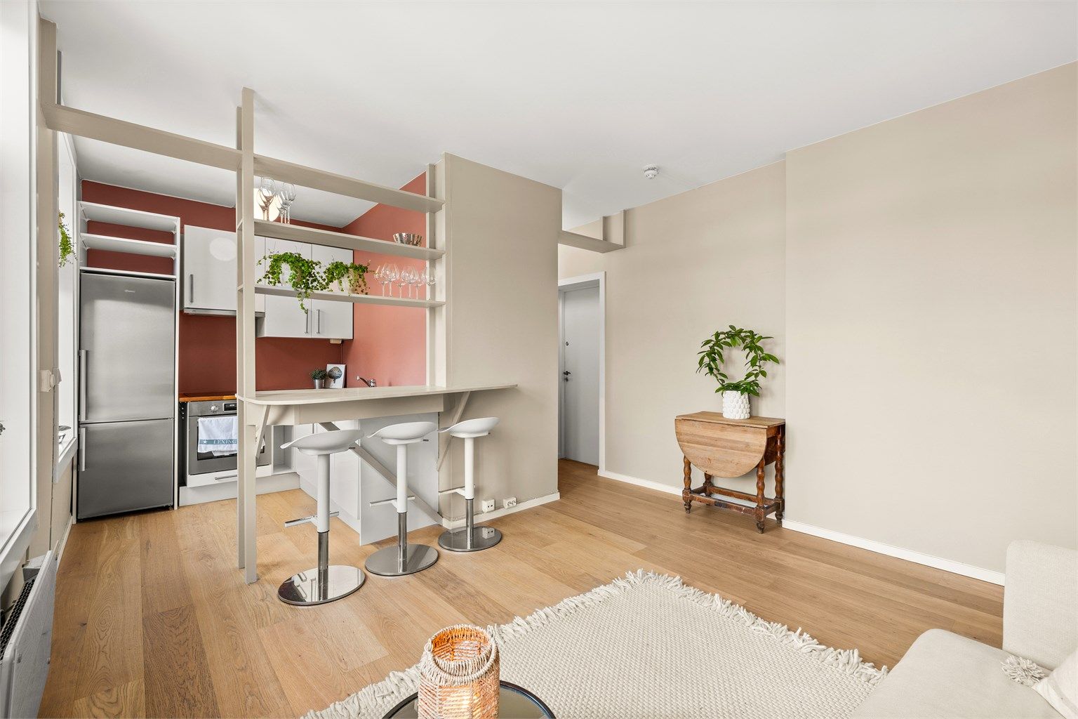 Denne lyse og luftige 2-roms leiligheten ligger høyt i 4. etasje med flott utsikt. Leiligheten fremstår med stilrene overflater, god takhøyde og store vindusflater som slipper inn rikelig med naturlig lys. Planløsningen er gjennomtenkt med en innbydende entré, flislagt bad, åpen stue- og kjøkkenløsning og et lunt soverom.