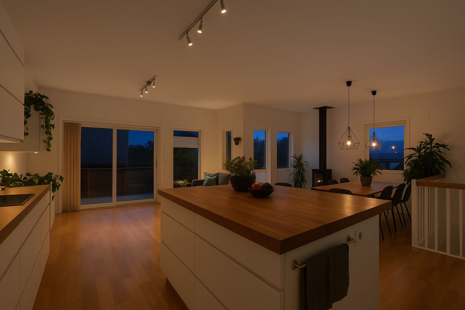 Boligen er gjennomgående lys og innbydende og har god og åpen planløsning med store vindusflater.