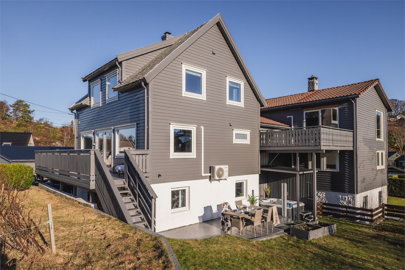 Meget pen og moderne halvpart av tomannsbolig med gjennomgående meget god standard. Boligen er vesentlig pusset opp de siste årene. Ikke godkjent utleiedel i 1 etasje på 48 m², leieinntekt kr. 10.000 eks strøm. Hoveddelen har 4 soverom i loftsetasjen og flott stue og kjøkken i 2 etasje. Helfliset bad/wc kombinert vaskerom i hoveddel og i utleiedel i 1 etasje. Rør-i-rør system i hele boligen. Varmepumpe i i stue i 2 etasje. Solrik altan med utgang fra stue i 2 etasje med trapp til markterrasse ved 1 etasje. Jacuzzi ved markterrasse. Egen isolert hagestue på 12 m² og garasje på 20 m² med el. bil lader. Tomten er ellers opparbeidet med plen, murer og beplantning. Kort gangavstand til barneskole, butikk, badeplass i Træet og turområder i skog og mark. Kort avstand til barnehager og fotballbane