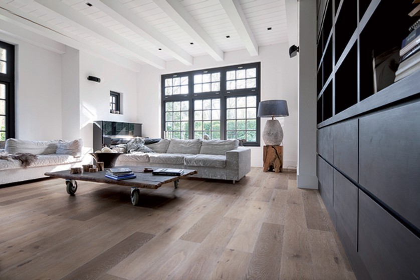 Vintage Caucasus - Ènstavs eikegulv (220 brede bord) med børstet, røkt og hvitoljet overflate . (Gulvspesialisten)